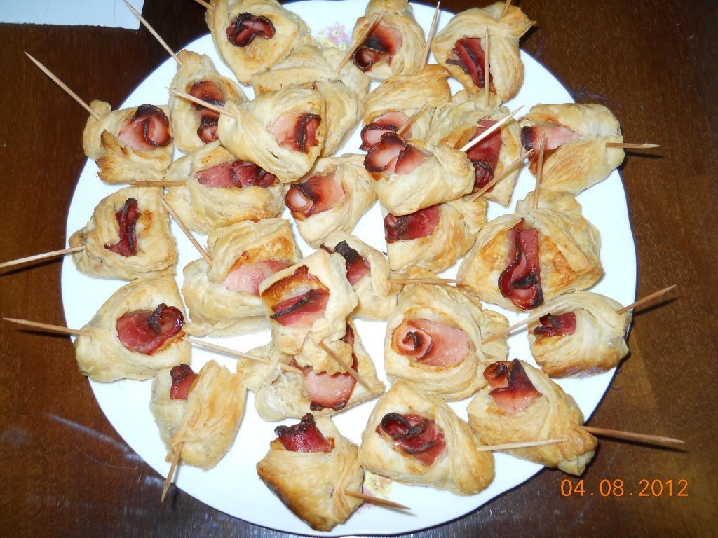 Se decongeleaza foile lasandu-le in frigider,se aseaza pe planseta , se taie in patratele cam de 4 cm ,partea de jos se intinde putin sa puteti forma cupa de trandafir ,din sunca se face un mic rulou care se imbraca in foietaj si la baza se strange putin , se fixeaza cu o scobitoare , lasand partea de sus libera .Se aseaja pe hartie de copt si se pun in cuptorul preincalzit,pe raftul de sus, circa 20-25 minute .Se servesc calde .