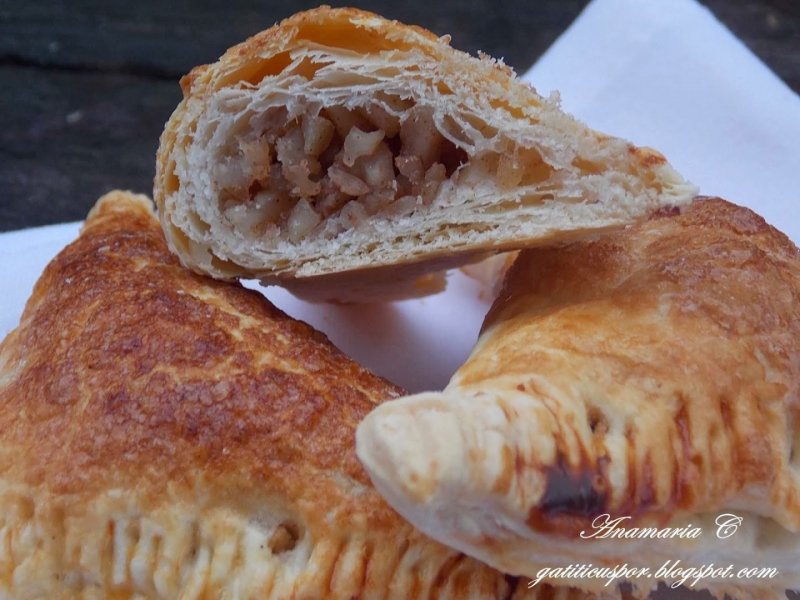 Taiati aluatul de foietaj in patrate de marimea dorita, adaugati o lingurita din amestecul cu mere pe unul din colturi si acoperiti cu celalalt colt astfel incat sa obtineti un triunghi. Sigilati cu ajutorul unei furculite apasand usor pe marginile triunghiului.