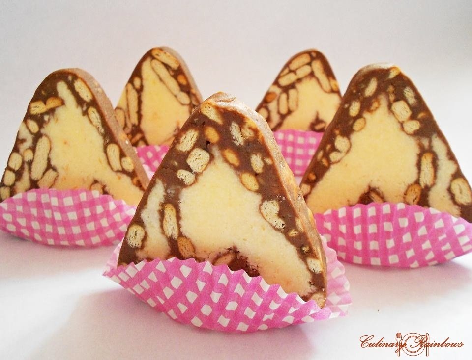 Vă place cum sună ”triunghiuladă”? :)) Când am vrut să pun rulada la rece am scăpat-o pe masă și s-a netezit puțin. :) Am ajutat-o și eu cu palmele și am presat-o ușor sub forma unui triunghi și-apoi, cum nu puteam să-i spun ruladă, draga mea Merișor a botezat-o instantaneu ”triunghiuladă”. Așa a rămas. :))