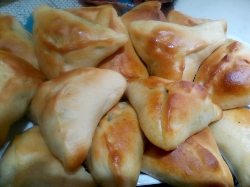 Lasam triunghiurile sa mai creasca în tava, nu mai mult de 10 min, apoi le ungem cu ulei de masline si le dam la cuptorul preincalzit la 180-200 de grade timp de 20-30 de minute, pana cand se rumenesc. Le scoatem din cuptor si le acoperim 10 minute cu un prosop curat.