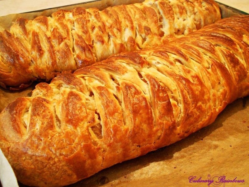 După ce am pus merele luăm fiecare franjur din ambele laturi și-l trecem unul peste celălalt obținând astfel o frumoasă împletitură. Aceasta va da ștrudelului nostru un aspect deosebit.
