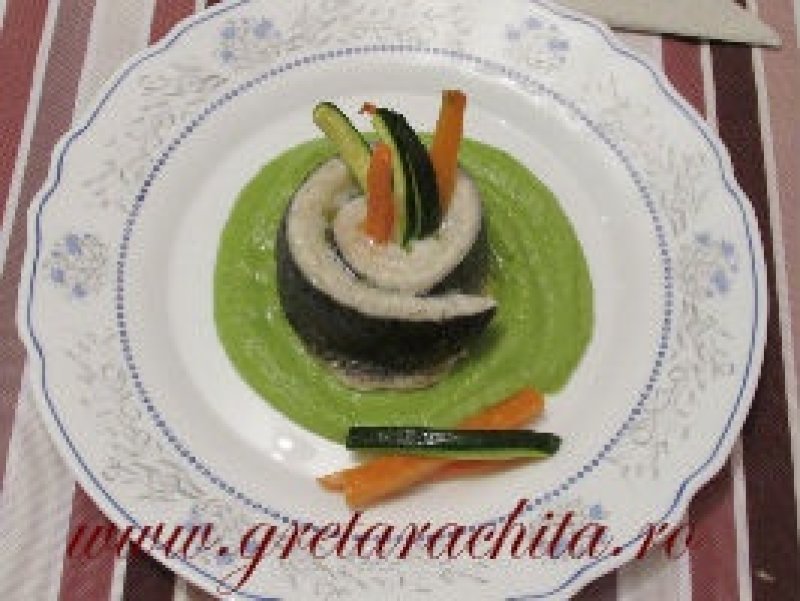 Am servit turbanul de peste pe o crema de mazare pe care am facut-o foarte simplu fierband mazarea si fruland-o impreuna cu putina smantana dulce si putina sare. Puteti face crema si din brocoli sau din bob.