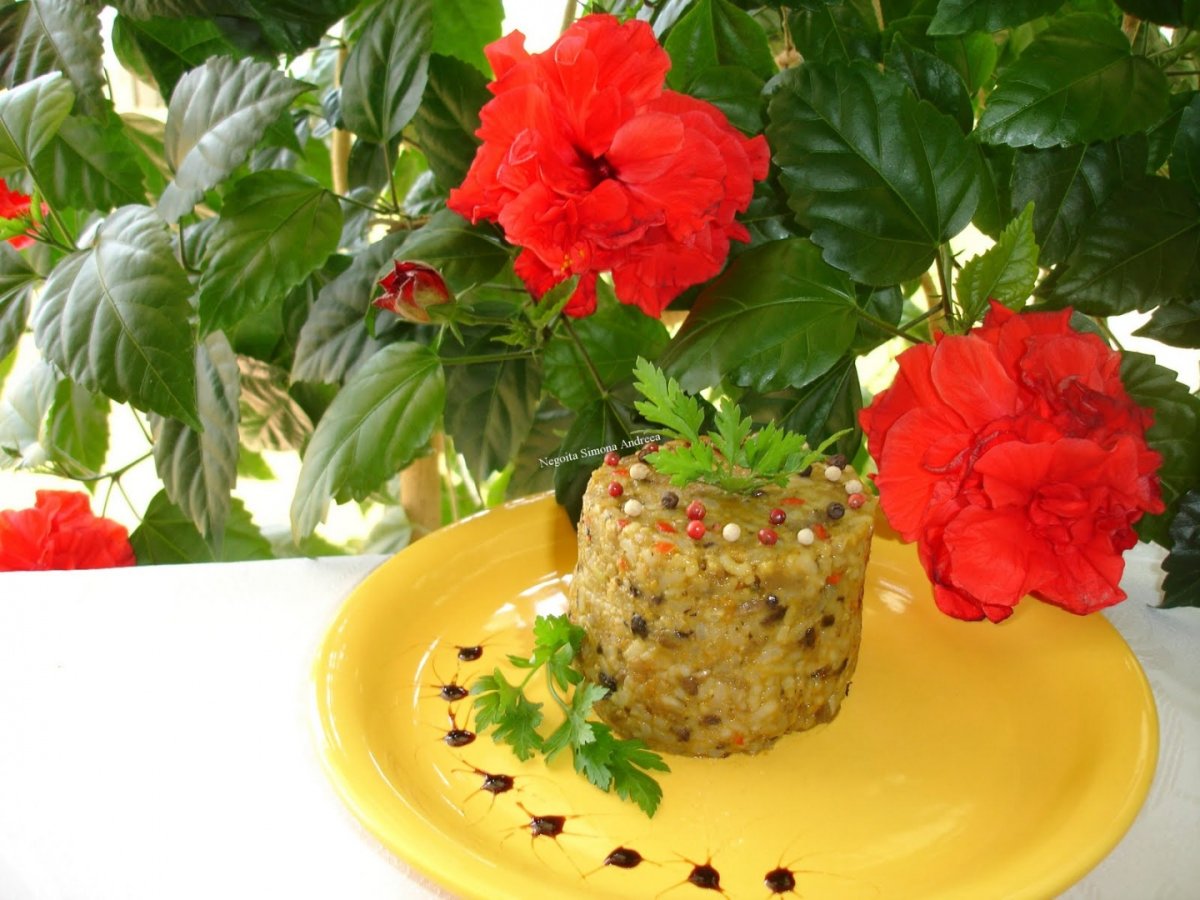 Ceapa, ardeiul si ciupercile se toaca marunt. Dovlecelul si vanata se dau prin razatoarea mare, morcovul prin razatoarea mica iar cartoful se taie in cubulete potrivite. Se caleste ceapa, se adauga apoi morcovul si se mai caleste putin, apoi orezul si la urma ardeiul. Dupa ce le-am calit bine se aduga dovlecelul, vanata si ciupercile. Se pune supa de carne si condimentele. Spre sfarsit se pun si cartofii si se lasa pana fierb toate legumele. Cine doreste poate adauga si suc de rosii. Se serveste atat cald cat si rece.