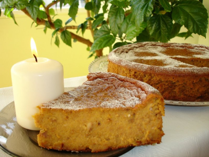 Pui dovleacul la copt apoi il cureti si cantaresti pulpa obtinuta. Amesteci faina cu praful de copt, separat mixezi ouale cu zaharul, romul, untul topit si laptele usor incalzit dupa care incorporezi usor faina. Adaugi dovleacul si nuca. Se pune compozitia intr-o forma detasabila de tort care a fost tapetata cu hartie de copt. Se baga la cuptorul incalzit pentru aproximativ 60 minute. Se taie rece si este foarte buna servita de la frigider.