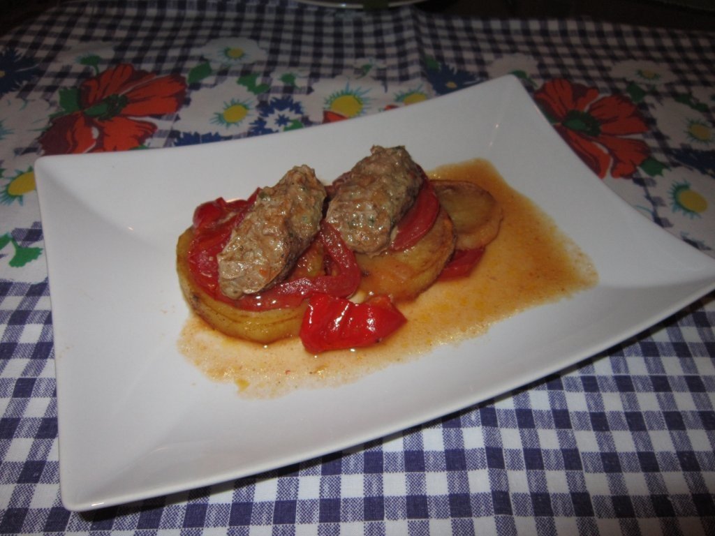 Dupa ce am efectuat toate aceste operatiuni, procedam la montarea preparatului, astfel asezam ca in imagine o felie de rosie, o felie de cartof, un "mititel", o bucatica de ardei si o luam de la capat.