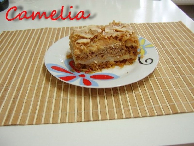 Am luat cele doua cepe, le-am curatat, le-am tocat si le-am calit pana s-au facut aurii. Apoi am pus carnea tocata si am prajit-o pana s-a dus tot sucul din ea. Cand s-a rumenit frumos am pus 200 ml suc de rosii si am lasat sa fiarba putin, apoi am dat-o la o parte de pe foc si am potrivit de sare si piper. Am tocat cele 3 verze, am scurs zeama, am pus varza intr-o cratita cu ulei si am calit-o, dupa care am pus restul de 400 ml de suc de rosii si am mai fiert-o putin. (Sucul meu de rosii este foarte gros asa ca fierb putin) Am dat si varza la o parte de pe foc, am piperat-o si am trecut la orez. Am spalat bine orezul si l-am pus la fiert cu 4 canite de apa. Cand a fiert l-am dat jos si m-am apucat sa aranjez straturile. Am luat o tava, am uns-o cu unt si tapetat-o cu pesmet si am asezat jumatate din varza calita. Deasupra am pus stratul de orez, peste care am pus carnea. Peste carne am pus un strat de smantana, iar peste smantana restul de varza. Varza am uns-o cu un strat de smantana si am introdus tava in cuptorul incins.