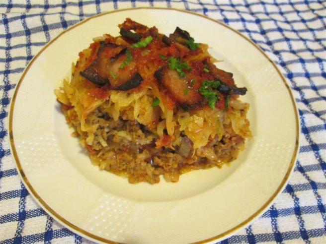 Introducem vasul la cuptor, pana se rumeneste usor. Noua ne place varza mai rumenita si eu l-am lasat mai mult la cuptor, cred ca vreo 2 ore, la foc mediu.