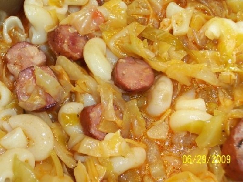 Tai varza si o frec cu sare apoi o las sa stea un pic si pregatesc carnatul. Carnatul il calesc numai un pic la foc mare fara sa adaug ulei. Pun varza in tava de aluminiu si amestec cu toate condimentele si apoi adaug carnatul. Ptr un pic de grasime adaug ulei de masline si apoi pun la cuptor la 365 F si dupa 10 minute amestec si adaug rosiile taiate marunt. Cand este aproape gata adaug cam o cana de bulion.
