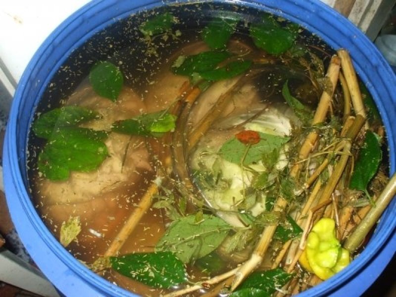 Puneti la foc o oala mai mare, umpleti-o cu apa si incalziti-o la aproximativ 40-45 grade (sa nu fiarba). Pentru fiecare litru de apa puneti o lingura plina bine de sare. Adaugati si celelate condimente si incalziti pe rand mai multe oale pana ce butoiul este aproape plin, sa mai ramana cam 7-8 centimetri pana sus.