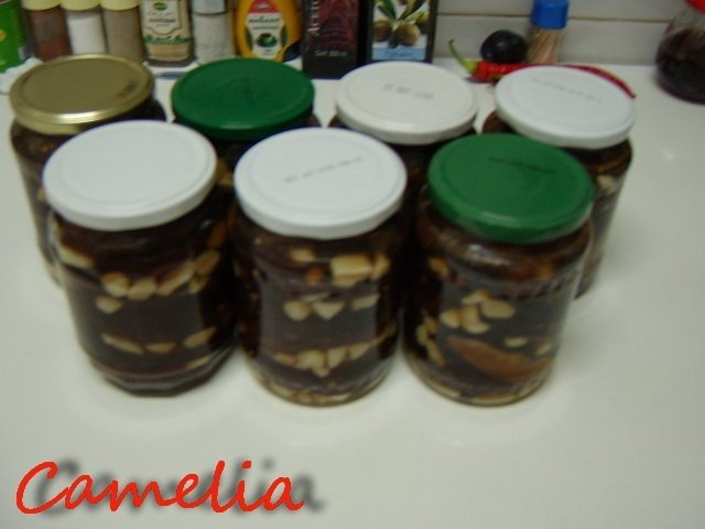 Se iau vinetele, se spala bine si se taie in felii. Se presara cu sare, se amesteca bine si se lasa cam o ora sa se scurga toxinele din ele. Apoi le luam, le stoarcem usor si le prajim pe ambele fete, dupa care le punem pe toate intr-un lighean sa se raceasca. In timpul acesta pregatim otetul. De regula vinetele le fac pe le sfarsitul lui septembrie, dar anul asta productia a fost mai repede si a prins si caldurile astea si de frica am facut otetul mai concentrat ca sa fiu sigura ca tin, dar de regula fac o parte otet si trei parti apa. Deci, in timp ce se racesc vinetele am pregatit otetul o parte otet si doua parti apa, iar la fiecare litru de lichid 1 lingura cu varf de sare si 2 cu varf de zahar, si le-am fiert. Intre timp am curatat si usturoiul. Incepem si punem in borcane. Punem 2 polonice de otet diluat intr-un borcan de 800g, taiem cativa catei de usturoi, punem 3-4 vinete, le presam usor, apoi punem iar usturoi, iar vinete, pana se umple borcanul. Daca mai este nevoie se mai pune lichid. Lichidul nu trebuie sa fie fierbinte. Vinetele trebuie sa fie uleioase pentru ca iarna le da un gust bun. Se insurubeaza capacul bine si se pun in camara.