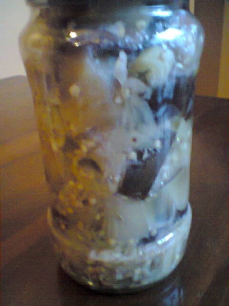 Vinetele se taie cubulete si se calesc in ulei. Se trag de pe foc si se adauga ardeiul iute si mujdeiul de usturoi. Se amesteca bine si se pun vinetele in borcane.