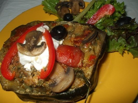 In jumatatile de vinete puneti intai bastonase de cascaval, apoi umpleti-le cu ce ati calit in tigaie. Asezati deasupra fiecarei vinete cate o felie de rosie (sau de sunca), bucatele de ciuperci si puneti-le intr-un vas mai inalt, bine inghesuite, pe un pat de felii de dovlecel si rosii. Turnati deasupra bulionul cat sa ajunga la nivelul vinetelor. Acoperiti cu folie de aluminiu (staniol) si dat vasul la cuptor la foc mic 30 minute.