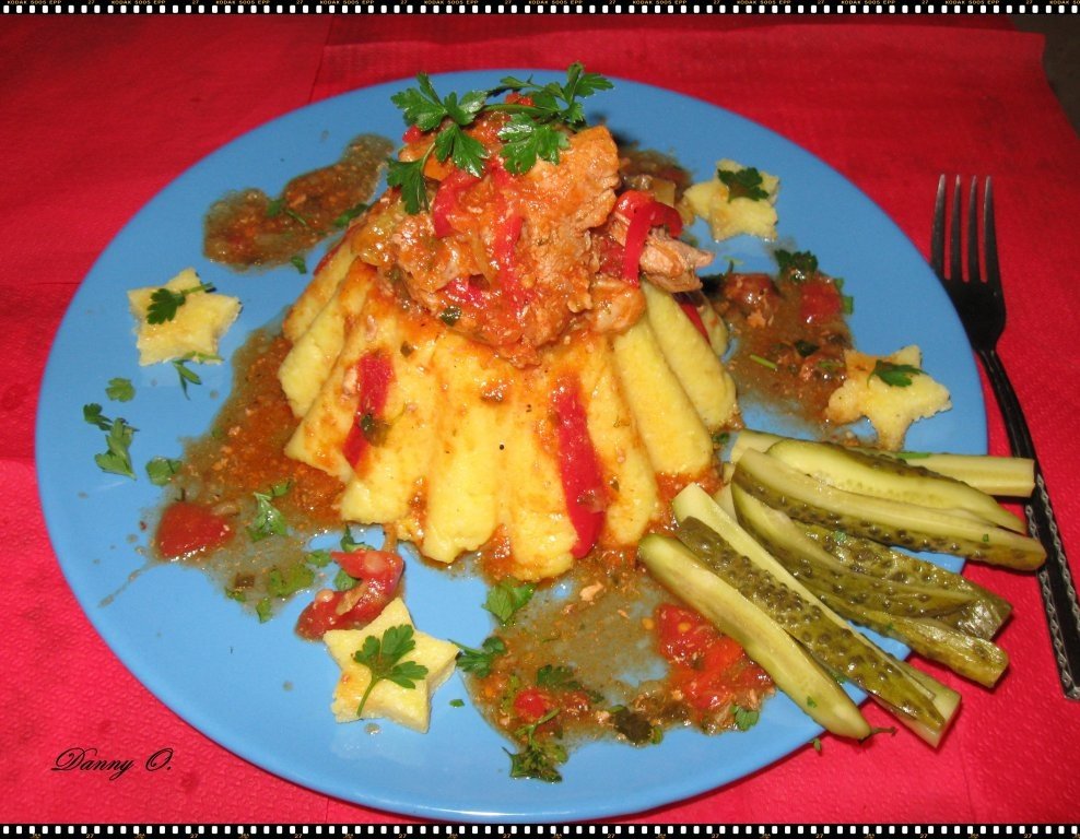 Carnea de porc se taie in cuburi potrivite si se pune la prajit intr-o tigaie. Ceapa se caleste si ea, dar separat. Ardeiul se taie julien. Carnea se pune intr-o oala,cu tot cu uleiul in care s-a prajit, peste care se adauga ceapa, ardeii si condimentele, dupa care se acopera cu apa si se baga la cuptor. Dupa 40 minute, adaugam rosiile in bulion, care au fost taiate cubulete. Se mai lasa la fiert 15 minute, dupa care adaugam usturoiul zdrobit si vinul. Dupa 5 minute se opreste focul si se adauga patrunjelul tocat marunt. Se serveste cu mamaliguta si castraveti bulgaresti. Pofta buna!