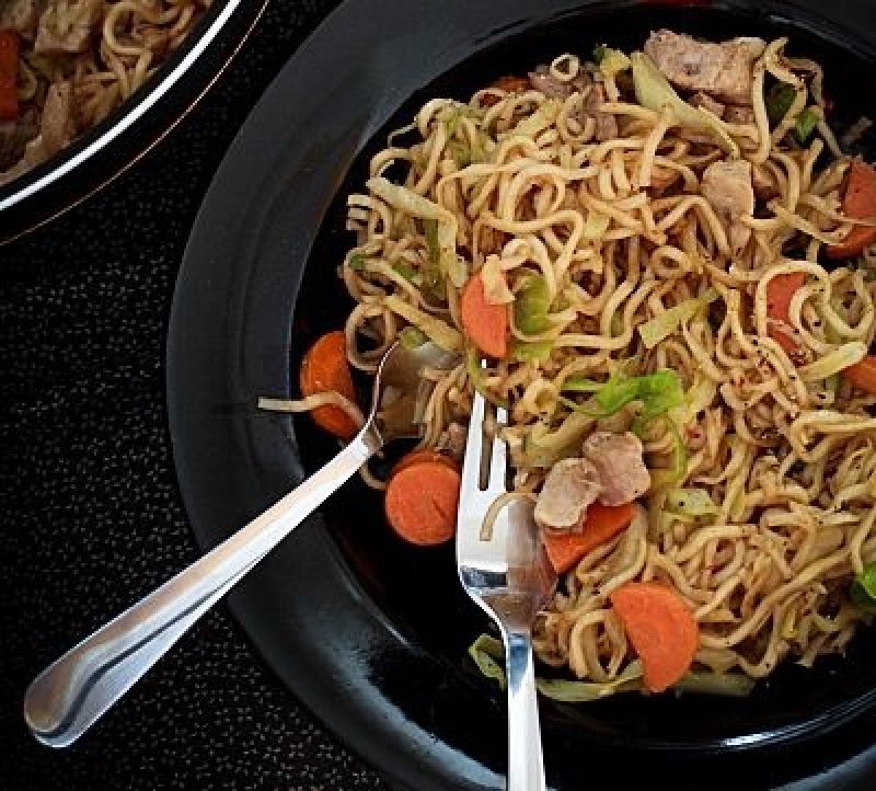 Pastele se pun la fiert in apa cu sare conform instructiunilor de pe ambalaj. Carnea se taie bucatele cat mai mici, varza se taie fasii, morcovii rondele.