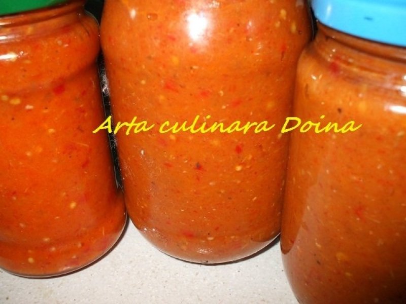 Intre timp pregatiti borcanele (cele mai indicate sunt pana in 330 g), intr-o cratita cu putina apa pe fund, eventual pe un prosop de bucatarie, pusa la incins la foc mic. Cand s-au incins borcanele, umpleti-le cat mai bine cu zacusca, apoi strangeti bine capacele si dati-le la cuibul de perne pentru sterilizat, pana a doua zi. Cand s-a racit, duceti zacusca in camara. Am folosit o cratita de tuci foarte mare. Mi-au iesit 20 de borcane de 370 g. Pentru ca imi place sa fie mai csipos (picant) am pus si vreo 10 peperoni rosii pe care i-am calit impreuna cu ceapa.