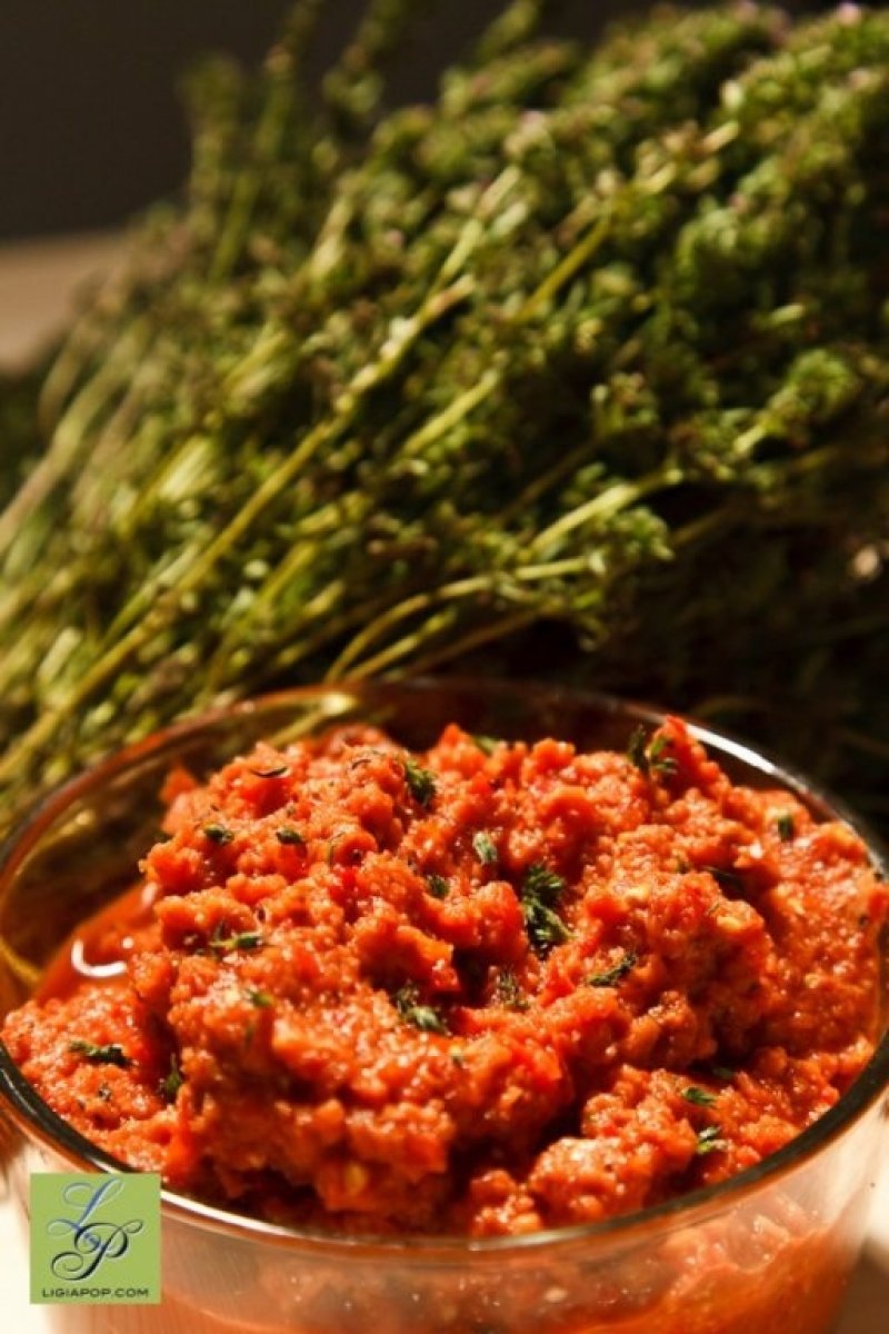 Pe timp de vara se pot folosi toate ingredientele prospete cu exceptia vinetelor care trebuie neaparat lasate la sare pentru 2h, si spalate bine inainte de folosire. Pe timp de iarna rosiile, ardeii si vinetele uscate se lasa la hidratat timp de ½ h. Toate se amesteca in blender, insa nu pana la omogenizare completa. Produsul final trebuie sa aiba o consistenta de zacusca. Daca compozitia este prea uscata, mai adaugati inca ½ ceasca apa.