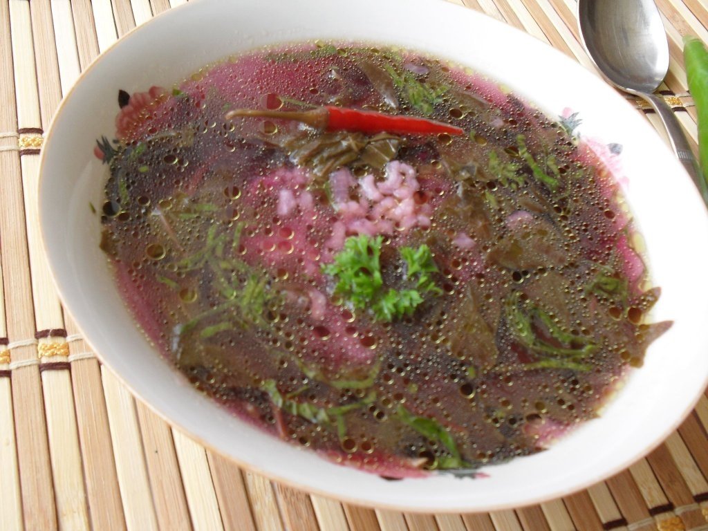 Intro oala punem uleiul la incins, adaugam ceapa pe care o calim usor, sa fie sticloasa, apoi adaugam frunzele de loboda rosie, spalate in cateva ape, le calim alaturi de ceapa pana se inmoaie, apoi adaugam vreo 3 litri de apa. Lasam zama la fiert, este suficient 10 minute, loboda fierbe repede. Peste loboda fiarta adaugam orezul, lasam ciorba sa clocoteasca, potrivim gustul de sare, inacrim cu otet si dupa 2 clocote stingem focul. Adaugam usturoiul zdrobit cu presa si leusteanul verde tocat. Aceasta ciorbica este usoara, racoritoare, vitaminizanta, daca luam in considerare ptoprietatile lobodei. Puteti servi cu ardei iute, merge de minune langa mamaliga calda.
