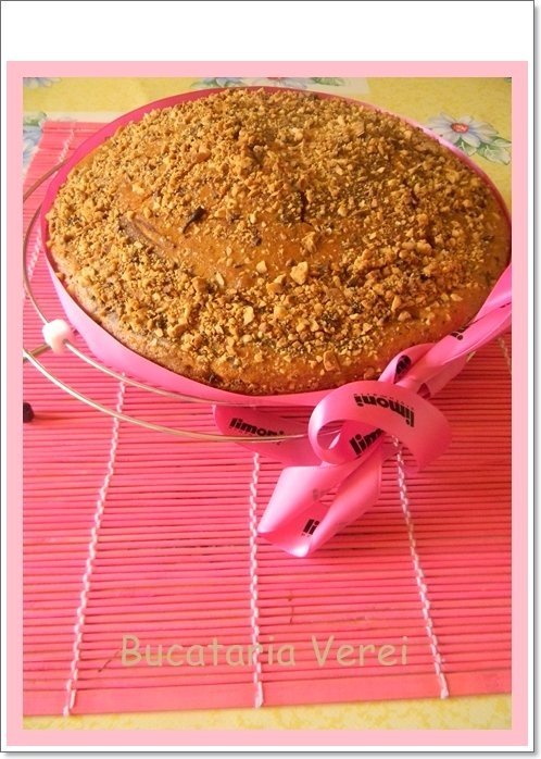 Nu se niveleaza,nu se bate tava de masa,se introduce in cuptorul cald 180°C timp de 40 minute;Deasupra am ornat cu alune prajite si faramitate ,inainte de-a introduce in cuptor!
