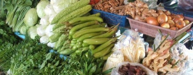 Nu exagerez cand spun ca erau mii de ingrediente; mai mult de jumatate imi erau total necunoscute, despre unele nici acum nu sunt lamurit daca erau de origine animala sau vegetala. Zeci de feluri de peste scoici, broaste, viermi de mare, caracatite, homari, creveti, calamari, raci, pui, rate, gaste, oua de zeci de feluri, zeci de feluri de fructe (am vazut si am gustat pentru prima oara durian, fructul dragon, mangustan, floare de bananier, un fel de frunze ca de salata numite morning glory, taro etc.), sute de feluri de legume si verdeturi, zeci de feluri de paste de creveti, creveti uscati, paste de curry, sosuri, pungi cu condimente boabe si seminte, orez din belsug, zeci de feluri de tofu, zahar de palmier, zahar din trestie, zeci de feluri de vinete (de la cele mici, cat un bob de mazare, la cele pe care le avem si noi pe piata) de culori diferite, ciuperci uscate, vin de orez, zeci de feluri de sosuri de peste, de otet, de sos de soia si sos de stridii.