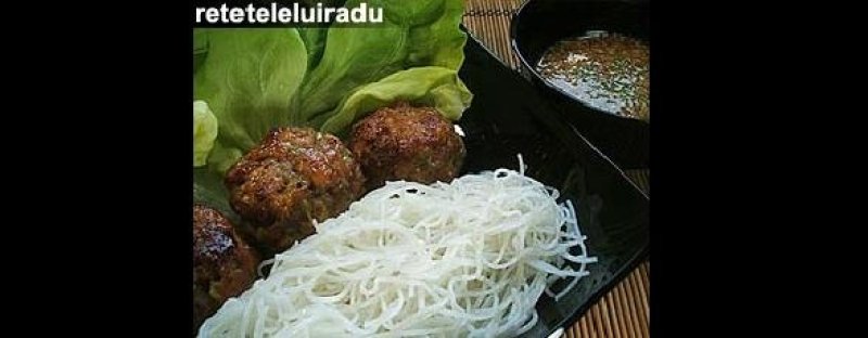 Se servesc pe farfurii individuale, alaturi de castronele cu sos nuoc cham. Se pun chiftelele in sos si se lasa la marinat 2 minute. Se scot apoi, se infasoara intr-o foaie de salata, impreuna cu taitei, si se mananca folosind mainile.