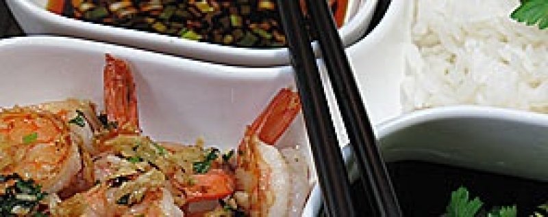 Se servesc crevetii imediat, cu sosul picant pe post de dip, alaturi de orez fiert.