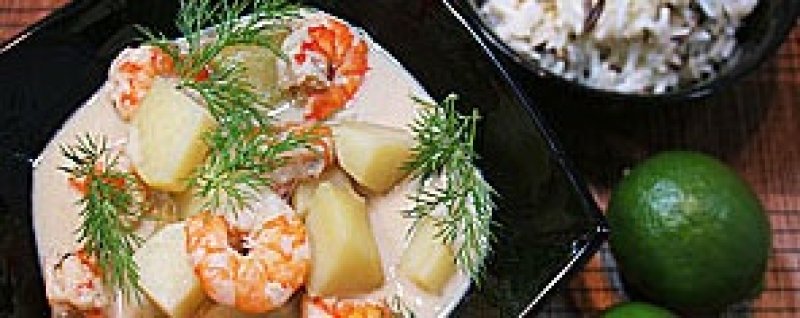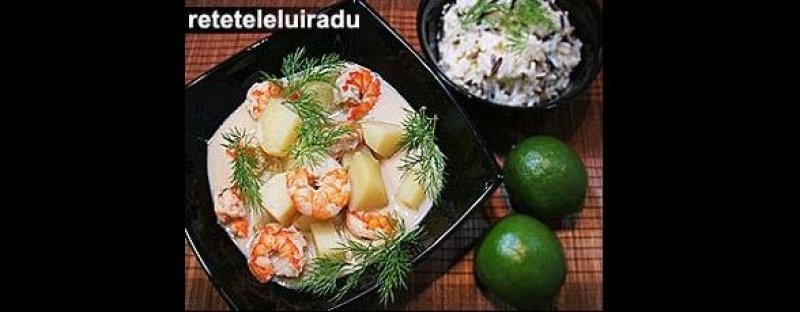 Nu se amesteca crevetii inainte de a fi roz, caci curry-ul va prinde miros de peste. Daca se folosesc creveti prefierti, se reduce timpul la 2 minute, atat cat sa se incinga crevetii.