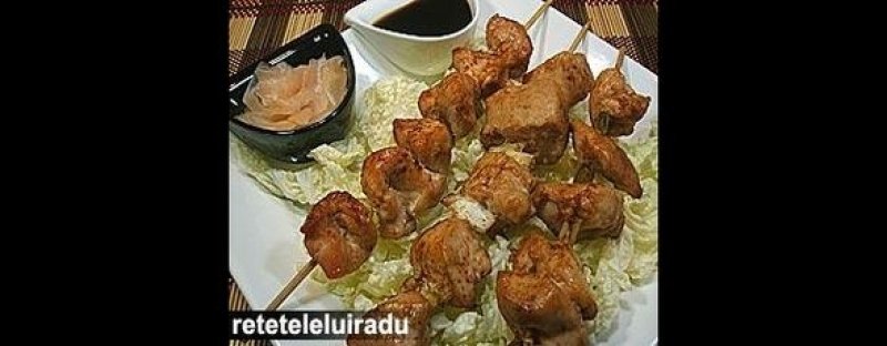 Se asaza frigarile pe grilaj si se frig sub grill, intorcandu-le de mai multe ori si umezindu-le de fiecare data cu sosul din craticioara, pana se rumenesc. Se servesc frigaruile fierbinti, alaturi de sosul ramas, presarate cu putina boia si insotite de feliute de ghimbir murat, daca se folosesc.