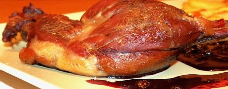 Cele două pulpe se pun apoi într-un vas termorezistent, se adaugă vinul şi se acoperă. Vasul se pune în cuptorul preîncălzit. Se fixează la temperatură medie (deoarece nu am cuptor cu afişajul temperaturii pot decât să vă spun că aceasta este medie) şi se lasă în jur de 50 de minute să fiarbă. Cu 10 minute înainte de a scoate vasul din cuptor se ia capacul pentru că dorim ca pulpele să aibă crustă crocantă.