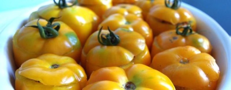 Am primit de la prietena mea, Simona, niste tomate galbene extraordinare. Sunt perfecte pentru umplut deoarece sunt carnoase insa miezul este destul de mic si nu trebuie scobite mult.