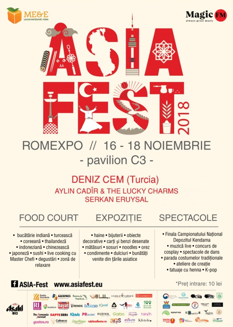 Cea de-a VI-a ediție a Festivalului Culturilor Asiatice - Asia Fest, ce are loc în perioada 16 – 18 noiembrie la Romexpo (pavilionul C3) are ca invitat special Turcia și aduce publicului bucureștean 3 zile de spectacole cu muzică și dansuri specifice, bucătărie tradițională asiatică, ateliere, expoziții și multe surprize de care vizitatorii se vor bucura cu siguranță. Intrarea este 10 lei, iar copiii sub 5 ani au acces gratuit.