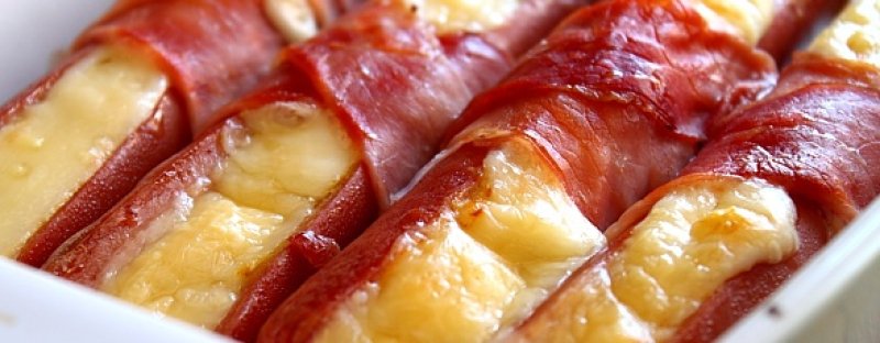 Ungem interiorul cremvurstilor cu mustar (cat doriti voi) si ii umplem cu cateva bastonase de cascaval. Ii invelim pe fiecare intr-o feliuta subtire de sunca afumata.