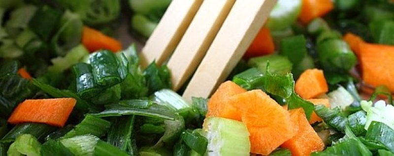 Tocam marunt coditele de ceapa, taiem patratele mici morcovul si tulpina de telina si le punem la calit in 2-3 linguri de ulei de masline.