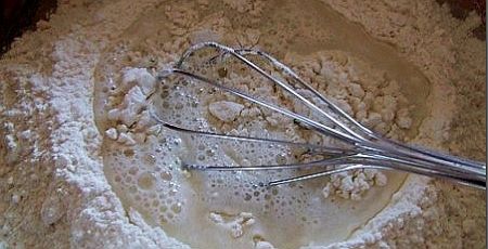 Eu am folosit o parte faina manitoba care este o faina de forta. Se poate folosi fara nici o problema doar faina alba normala. Rezultatul va fi acelasi. Deci, turnati treptat apa si amestecati cu o lingura de lemn initial dupa care incepeti sa framantati pana obtineti o biluta elastica,