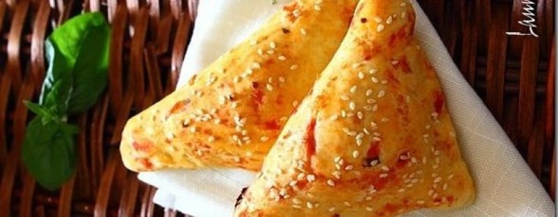 Impaturim fiecare patrat in forma de triunghi avand grija sa inchidem bine marginile presandu-le cu o furculita sau cu degetele. Ungem fiecare triunghi cu sos de rosii si pudram cu susan. Dam drumul la cuptor la 200 grade si pana se incalzeste, ele vor creste cat este nevoie. In momentul in care cuptorul s-a incins, le bagam pentru 15-20 minute dupa care le servim.