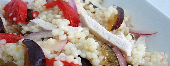Pui, prune si cuscus? Cam ciudat ar spune unii. Insa atata timp cat esti dispus sa incerci si ceva mai "altfel" decat meniul conservator de traditional de la mama de acasa... eu va spun, dragilor, incercati aceasta salata. Un pranz usor cu savoare dulce-acrisoara. O impletire de arome, forme si culori. Va prezint astazi salata de pui cu prune si cuscus.