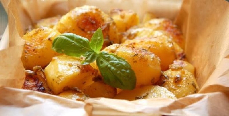 Cuptorul fiind deja incins, puneti o foaie de copt intr-o tava, aruncati cartofii acolo, avand grija sa nu-i permiteti sosului sa curga din hartie-n tava. Deci puneti o bucata mai mare - nu faceti economie - acoperiti cartofii cu o folie de aluminiu si dati tava la cuptor pentru 30 - 40 minute la 190 grade.