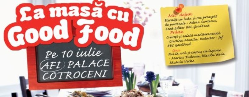 Duminică, 10 iulie, la Afi Palace Cotroceni, în cupola centrală, se lasă cu dezmăţ culinar! Dacă vrei să ne cunoşti mai bine, dar şi pentru că ne place să gătim din plăcere, echipa Good Food te invită la masă alături de prietenii săi! Intră pe site-ul www.goodfood.ro să te înscrii alegând momentul zilei în care vrei să iei masa alături de noi. La final, punem pe masă şi premiile Good Food.