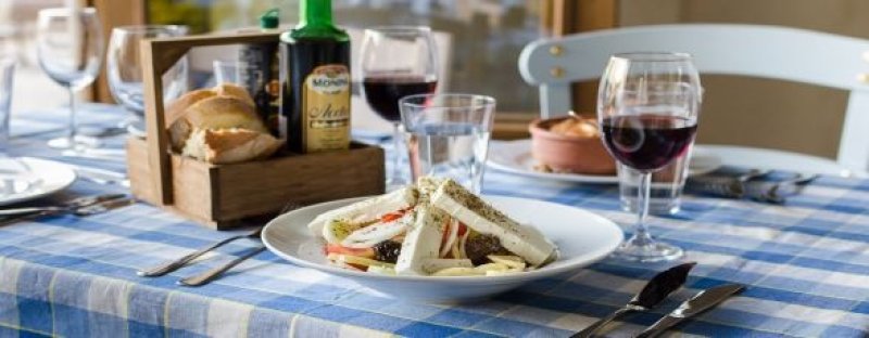 Din meniu nu lipsesc cele mai populare feluri (tzatziki, horiatiki - celebra salată grecească, moussakas sau souvlaki), dar nici mâncărurile “de suflet” ale grecilor, mai puţin cunoscute turiştilor (arnaki kassandrino, loukaniko horiatiko, portokalopita).