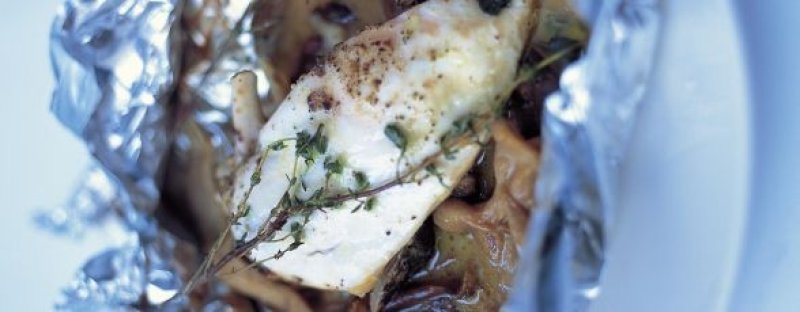 Piept de pui la pachet, cu ciuperci, unt, vin alb si cimbru