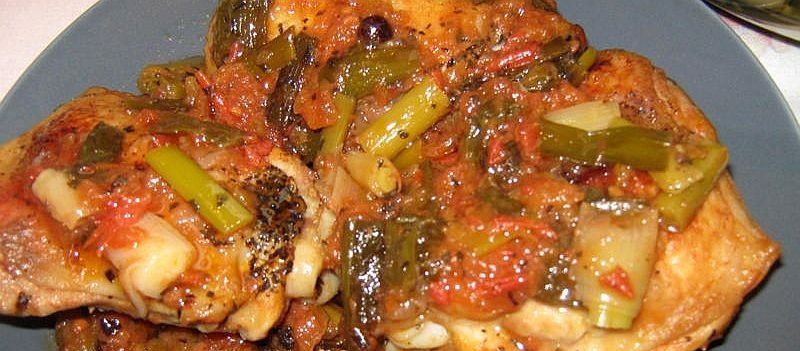 Am taiat ceapa si usturoiul in bucati de 3-4 cm si le-am calit putin, pana ce s-au inmuiat in unt. Am adaugat 200ml suc de rosii si am condimentat. Am lasat sa fiarba 10 minute. Am pus sosul intr-un vas si peste am asezat carnea de pui. Am continuat gatirea la cuptor timp de 40-45 minute pana ce carnea s-a rumenit delicios.