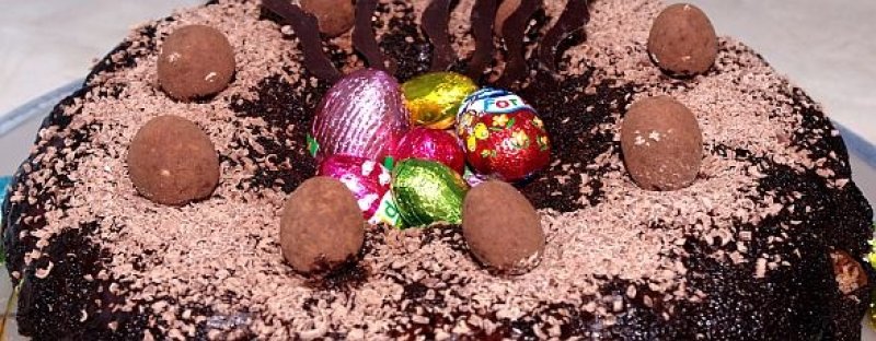 După ce siropul s-a absorbit în tort decorăm cu ciocolată rasă şi cu ouă din zahăr colorat sau alte dulciuri.