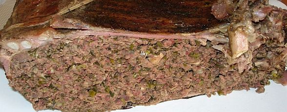 Luam mielul, pe care l-am spalat bine si l-am sters cu prosop absorbant, ii facem un buzunar pe sub piele. si-l umplem cu compozitia pregatita, nu-l indesam prea tare deoarece se poate crapa la copt. Dupa ce l-am umplut, coasem gura buzunarului cu ata alba de bumbac.