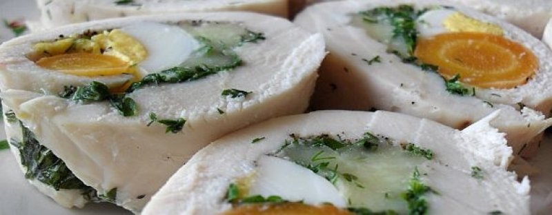 O jumatate de piept mare se taie in doua, insa nu de tot, in asa fel incat sa obtinem o bucata mare de carne, il desfacem, il batem cu ciocanul de carne, il piperam, il saram, apoi asezam morcovul fiert, oul curatat si taiat in 4 pe lungime. Punem verdeata tocata marunt de-a lungul morcovelui si oului. Rulam carnea si o invelim in staniol pe care il sucim la capete si punem pieptul astfel rulat intrun vas cu apa care fierbe. Lasam la fiert cam 10-15 minute la foc potrivit. Aveti grija ca ruloul sa fie acoperit cu apa. Dupa 10-15 minute scoatem carnea de la fiert, indepartam staniolul, lasam sa se racoreasca putin apoi taiem felii de grosimea degetului. Se consuma cald sau rece. Dintr-o jumatate de piept rezulta 8 rulouri.