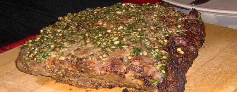 Intre timp tocam toate frunzele cu piperul rosu si cateii de usturoi, se amesteca impreuna si se tavaleste carnea in acest strat de mirodenii. Asteptam 10 minute si o taiem felii subtiri.
