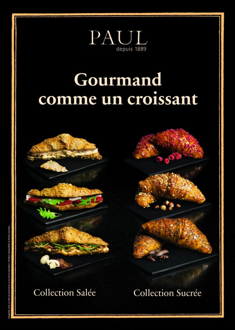 Brutăriile Paul introduc în colecţiile de croissante dulci şi sărate şase sortimente noi, preparate după rețete delicioase franțuzești. Campania „Gourmand comme un croissant” aduce în gama Croissant sucrée (dulci) trei rețete cremoase şi fructate, cu cremă de ciocolată, cremă de vanilie şi zmeură sau cremă de ciocolată şi alune, iar în gama Croissant salée (sărate) trei combinații apetisante: somon şi praz, brânză de capră şi roşii deshidratate sau bacon şi sote de ciuperci.