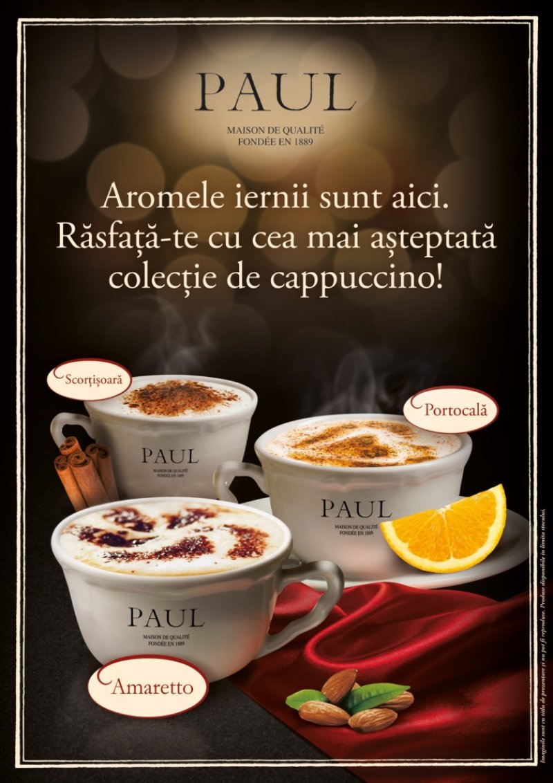Brutăriile Paul îşi îmbogăţesc gama de cafea cu trei noi sortimente de cappuccino aromate care descriu perfect atmosfera sărbătorilor de iarnă. Acestea se găsesc sub denumirea Cappuccino Collections şi au arome de Amaretto, Scorţişoară şi Portocală. Astfel, clienţii Paul sunt invitaţi să înceapă sărbătorile alături de o ceaşcă de cappuccino cald, în orice brutărie Paul din Bucureşti şi Ploieşti.