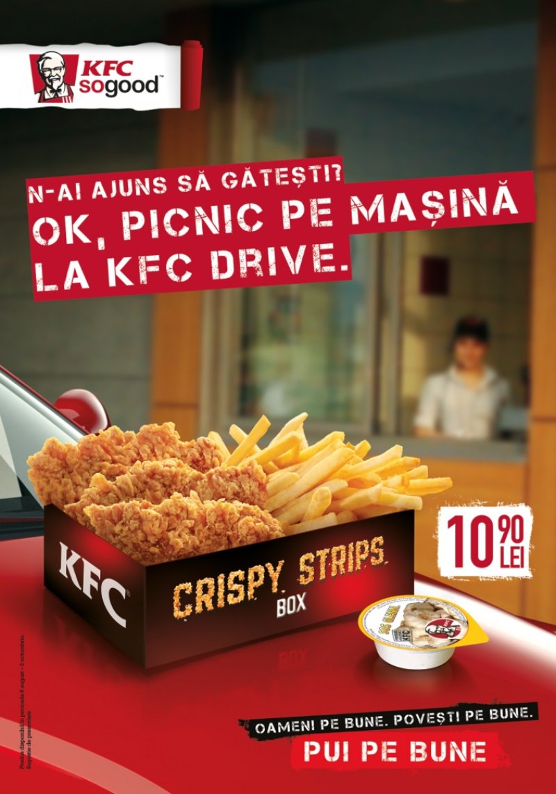 KFC lansează două noi oferte pentru Crispy Strips, cel mai bine vândut și apreciat produs din meniul KFC în România. Crispy Strips Menu Box este un pachet complet ce conține 6 Crispy Strips, o porție medie de cartofi prăjiți, o salată Coleslaw, o răcoritoare la 0,4 l și un sos la alegere, toate la prețul promoțional de 22,5 lei. Crispy Strips Box este o alegere smart care conține, la prețul de 10,9 lei, 3 Crispy Strips, o porție medie de cartofi prăjiți și un sos la alegere.