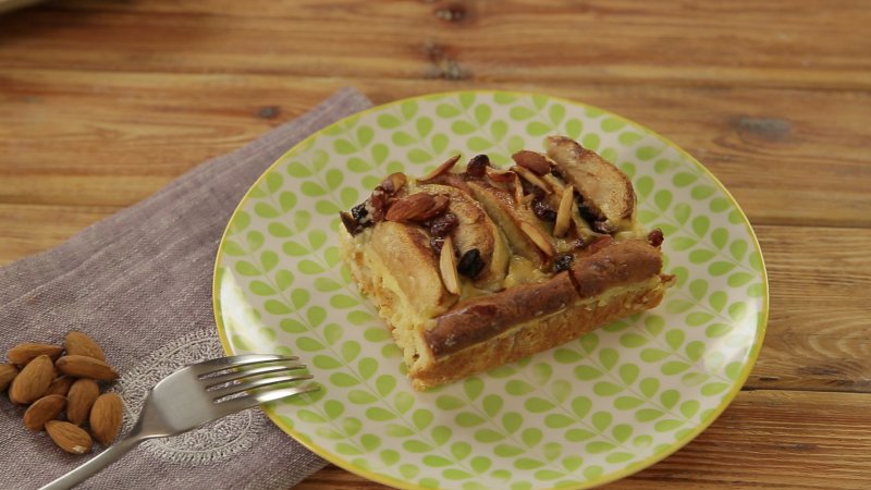 Umplutura: Se prepară Puddingul conform instrucțiunilor de pe plic, merele se curăță de coajă, se taie în sferturi și apoi în felii. Peste aluatul din tavă se întinde budinca preparată și se așază feliile de mere precum țiglele pe acoperișul unei case. Deasupra se împrăștie cât mai omogen stafidele și migdalele.