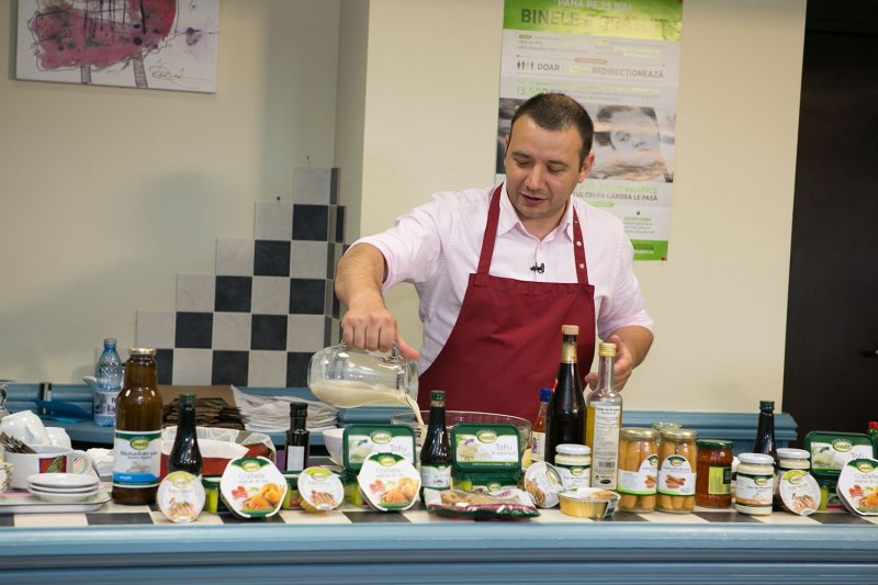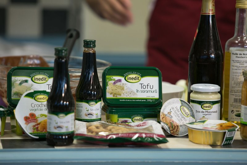 Chef Marius a deschis sesiunea de gătit cu un desert pe care l-a pregătit in premieră pentru noi, o prăjitură delicioasă pe bază de lapte de soia. Apoi, ne-a delectat atât papilele gustative, cât şi ochii prin prepararea într-un timp foarte scurt a patru feluri savuroase: crenvurşti din soia in foietaj, salată de crudităţi cu tofu, tofu picant şi tofu cu noodles şi sos de soia, precum şi a unei salate cu castraveţi şi sos de soia. Adept al gătitului rapid şi simplu, dar parfumat şi delicios, chef Marius ne-a demonstrat că produsele pe bază de soia constituie feluri de mâncare nu doar sănătoase, ci şi gustoase.