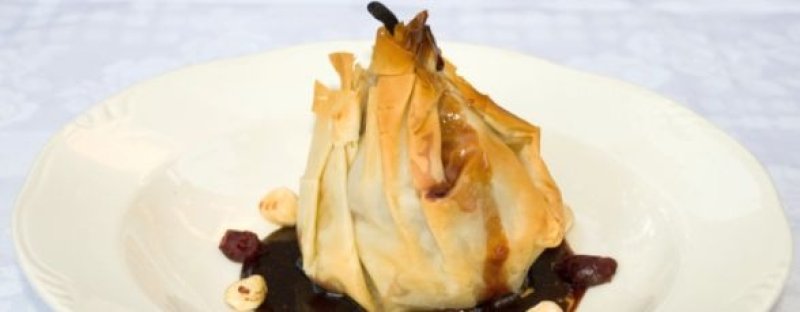 Intinde o foaie de placinta, unge-o cu unt topit si presar-o cu zahar. Peste ea pune inca 3 foi de placinta, ungandu-le cu unt si zahar. In centru pune 1 parte din amestecul de ciocolata. Deasupra pune o para si infasoara in jurul ei foile de placinta. Unge-le cu putin unt si presara-le cu putin zahar.